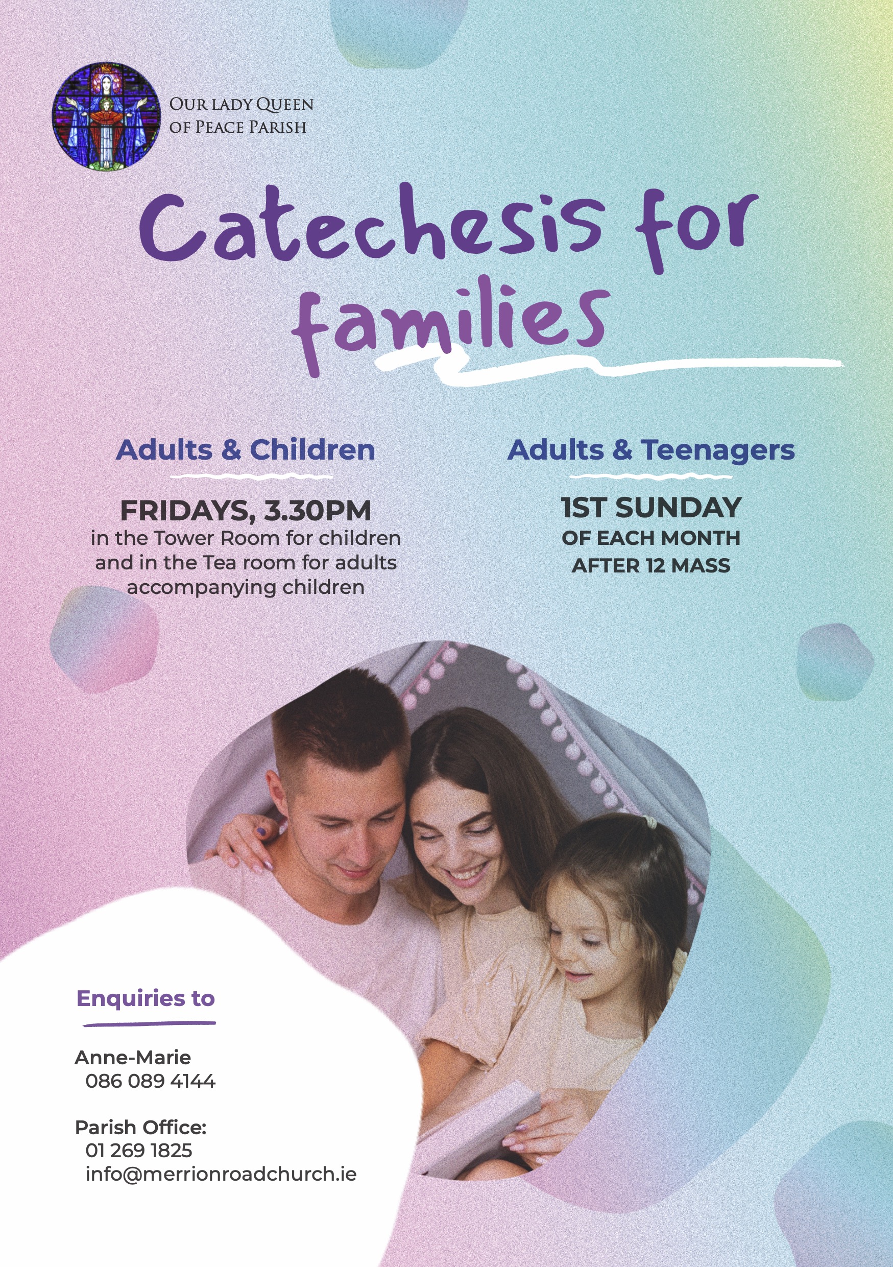 Catechesis for Families takes place on Fridays at 3.30pm in the Tower Room for children and in the Tea Room for adults accompanying children.